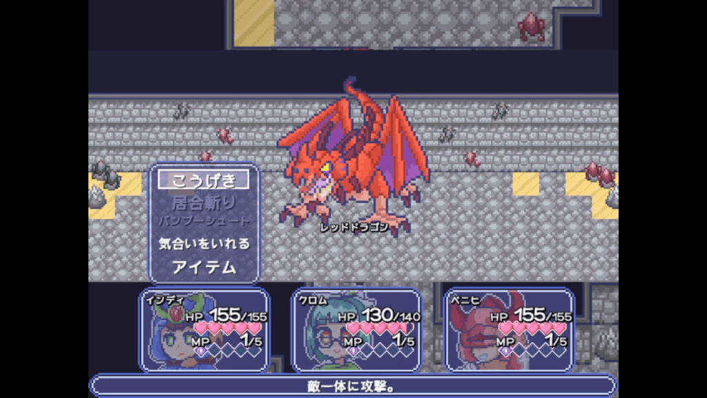 画面いっぱいに広がるドット絵の敵と向き合い、「こうげき」「アイテム」といった王道のコマンドを選んで戦うスタイルは、当時を知るプレイヤーなら、きっと懐かしい気持ちがよみがえるはず。