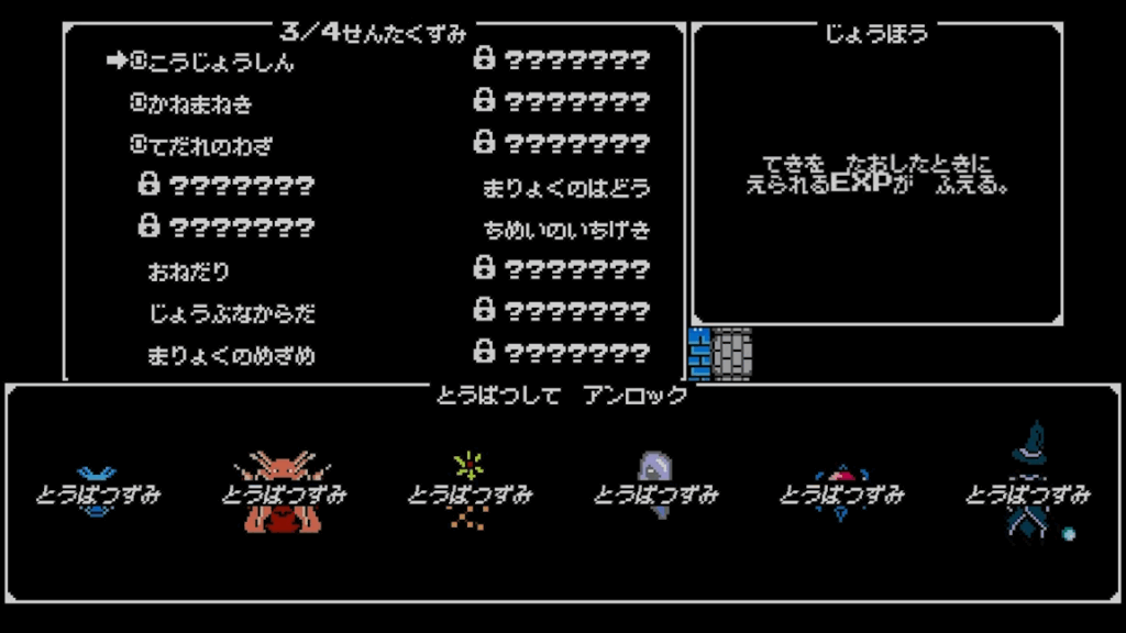 これは特定のモンスターの組み合わせを討伐することでアンロックされる仕組みです。たとえば、騎士系モンスターを2種類討伐すると新たな「さいのう」を覚えられる、といった具合です。ドラゴン族を特定の3種類討伐すれば「ほのおのブレス」への耐性が得られるなど、多彩な効果が用意されています。