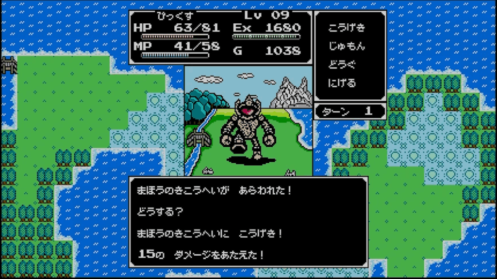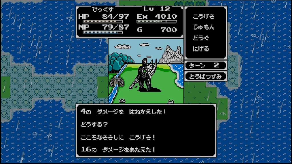 町で武器やアイテムを整え、ダンジョンを探索し、重要なアイテムを集めて敵の居城を目指します。戦闘はオーソドックスなターン制で、「こうげき」「じゅもん」「どうぐ」を駆使してモンスターと渡り合う仕組みです。
