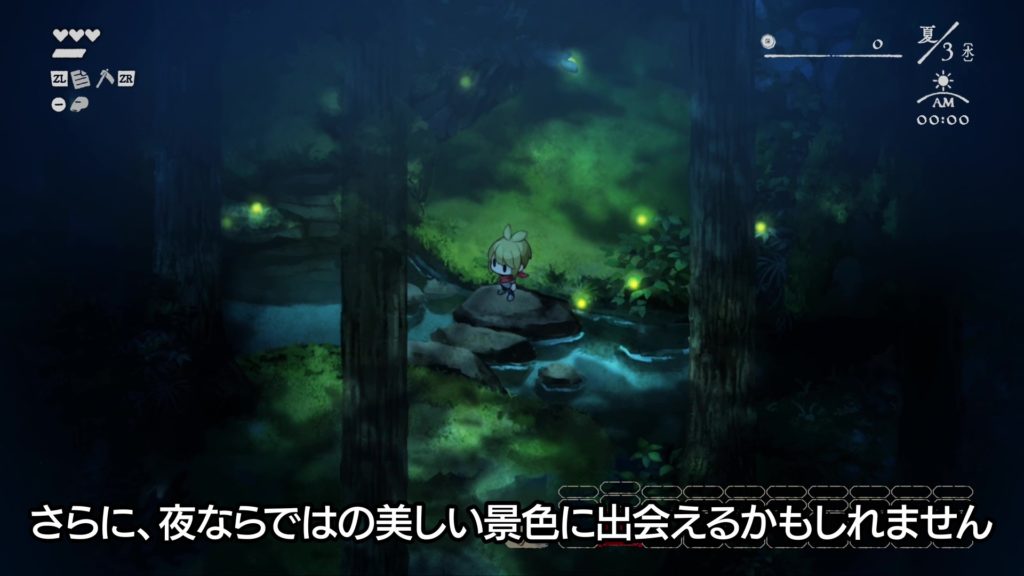 昼だけでなく、深夜の村を歩けるのが本作の大きな特徴。探索で昼の生活に役立つ素材を入手でき、さらに夜ならではの景色に出会えるのも楽しみです。