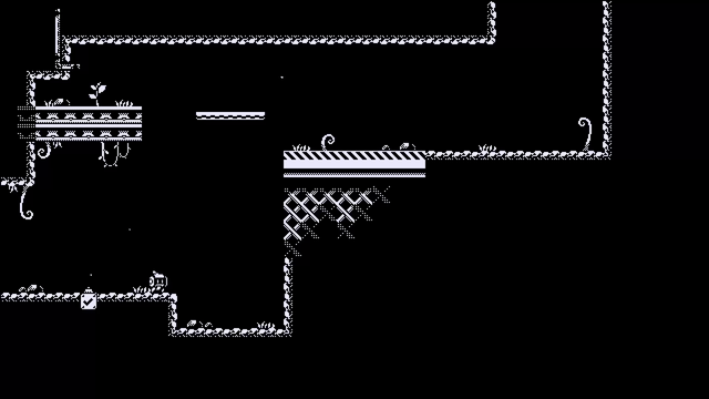 モノクロのピクセルアートで描かれた世界を、小さなロボットと一緒に進んでいく。