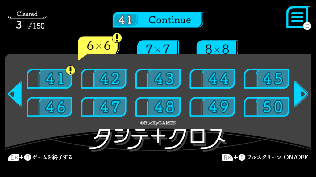 6×6、7×7、8×8の3つの難易度が用意されており、マスが増えるほど難易度も上がります。