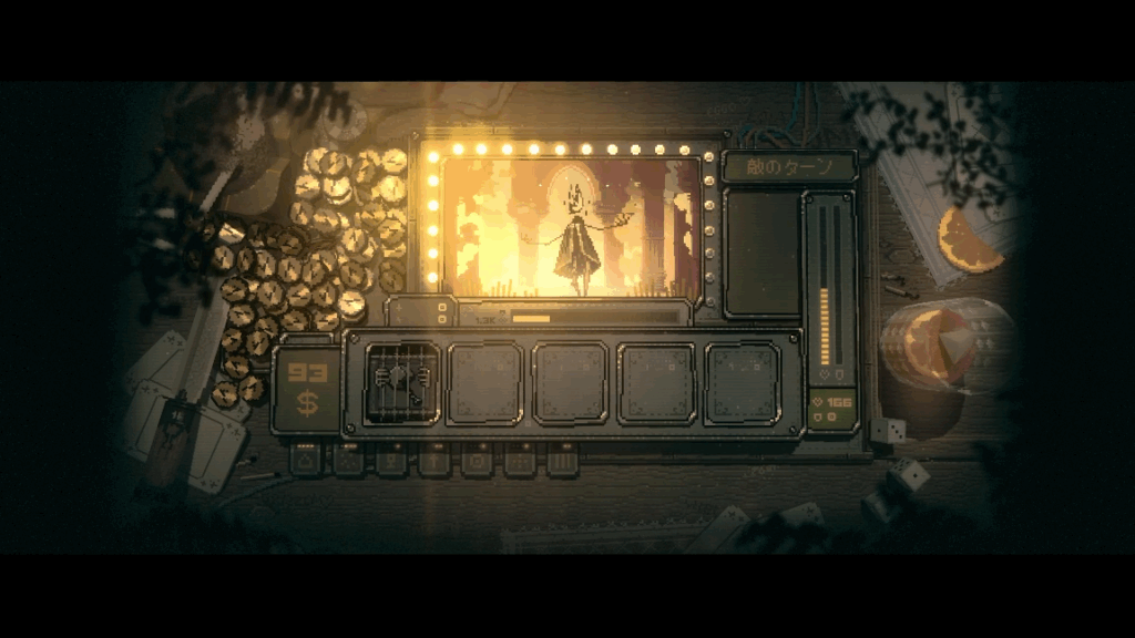 スロットリールのついたテーブルには小さな液晶がほんのり光を放ち、その小さな枠の中に古めかしいピクセルアートの世界が息づいている。
