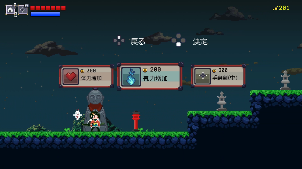 和風のピクセルアートで彩られたステージを、カエデが軽やかに駆け抜けていく様子を見ているだけでも、本作の魅力が伝わってきました。