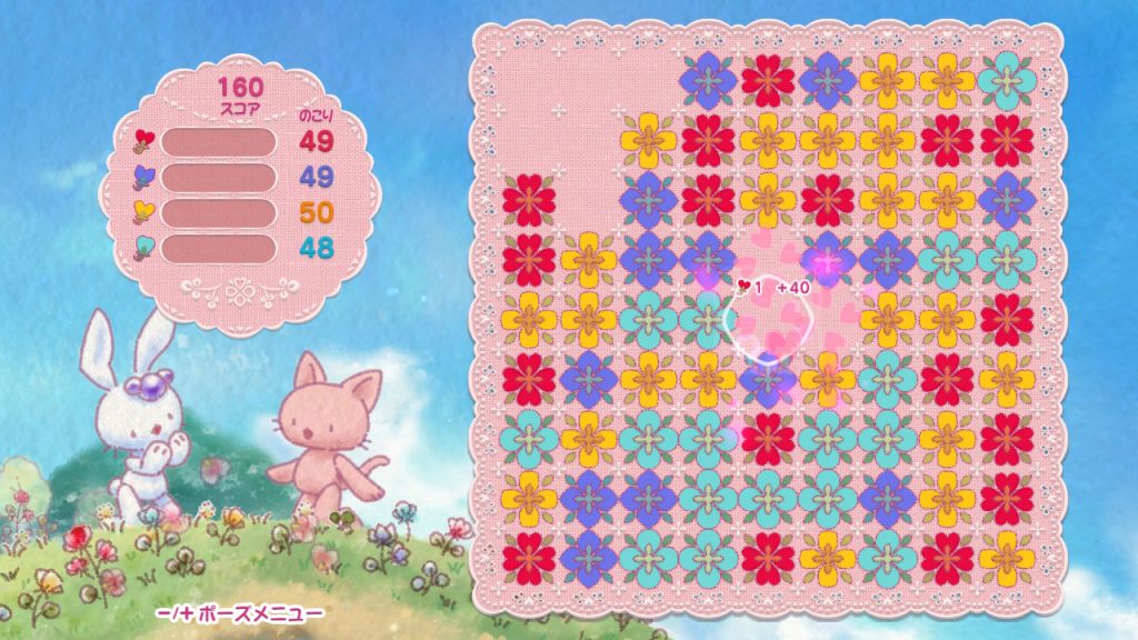 2個以上つながっている同じ色の花を選択すると、その花は消えてハートバルーンになります。5個つながっていると5個一気に消えるといったルールです。